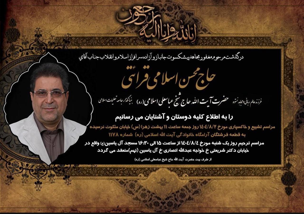 با کمال تأسف و تأثر، درگذشت برادر همسر گرامیتان، مرحوم مغفور حاج محسن اسلامی قرائتی، مومن وارسته و مبارز انقلابی، فرزند عالم ربانی و مجاهد نستوه، حضرت آیت الله حاج شیخ عباسعلی اسلامی (ره) بنیان‌گذار جامعه تعلیمات اسلامی را به محضر مبارک حضرتعالی و خانواده محترم تسلیت عرض می‌نماییم . از درگاه خداوند متعال، برای آن مرحوم ، علو درجات و رحمت و مغفرت واسعه الهی و برای حضرتعالی و بازماندگان صبر و سلامتی مسئلت می نماییم.